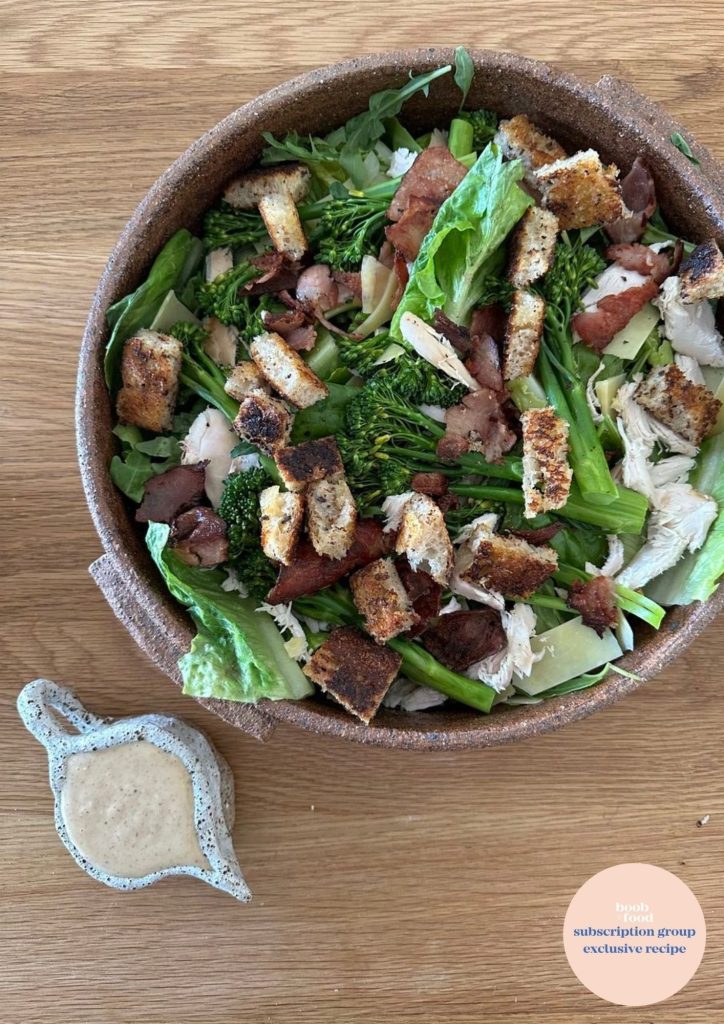 Pop lettuce and capers and broccolini in a large bowl, top with the croutons, bacon, chicken, parmesan cheese and eggs. Drizzle over the dressing when ready to serve.