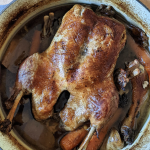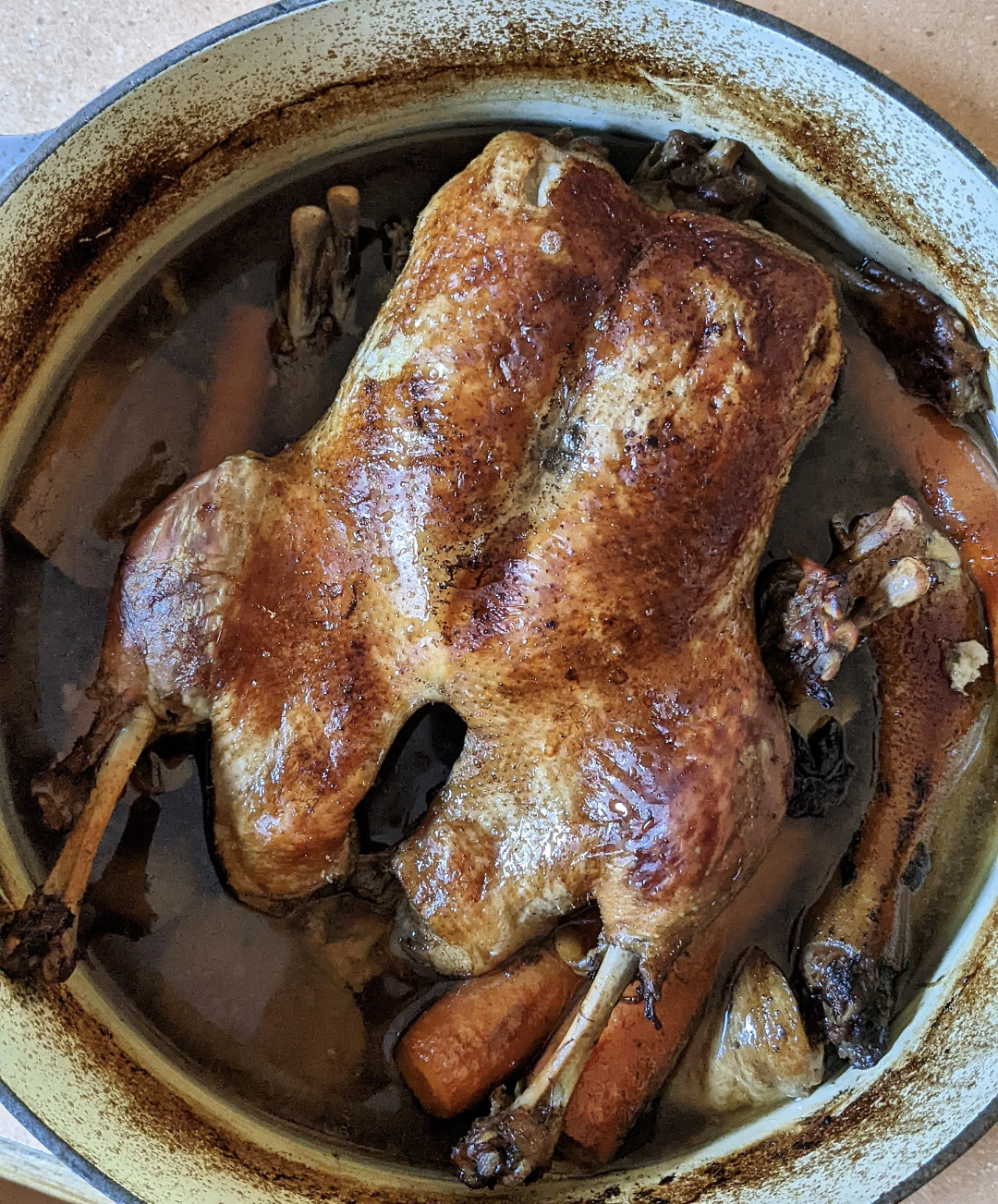 Remove the duck from the oven and flip it over. Turn up the oven to 220 and cook for a further 15 minutes until crispy on top.