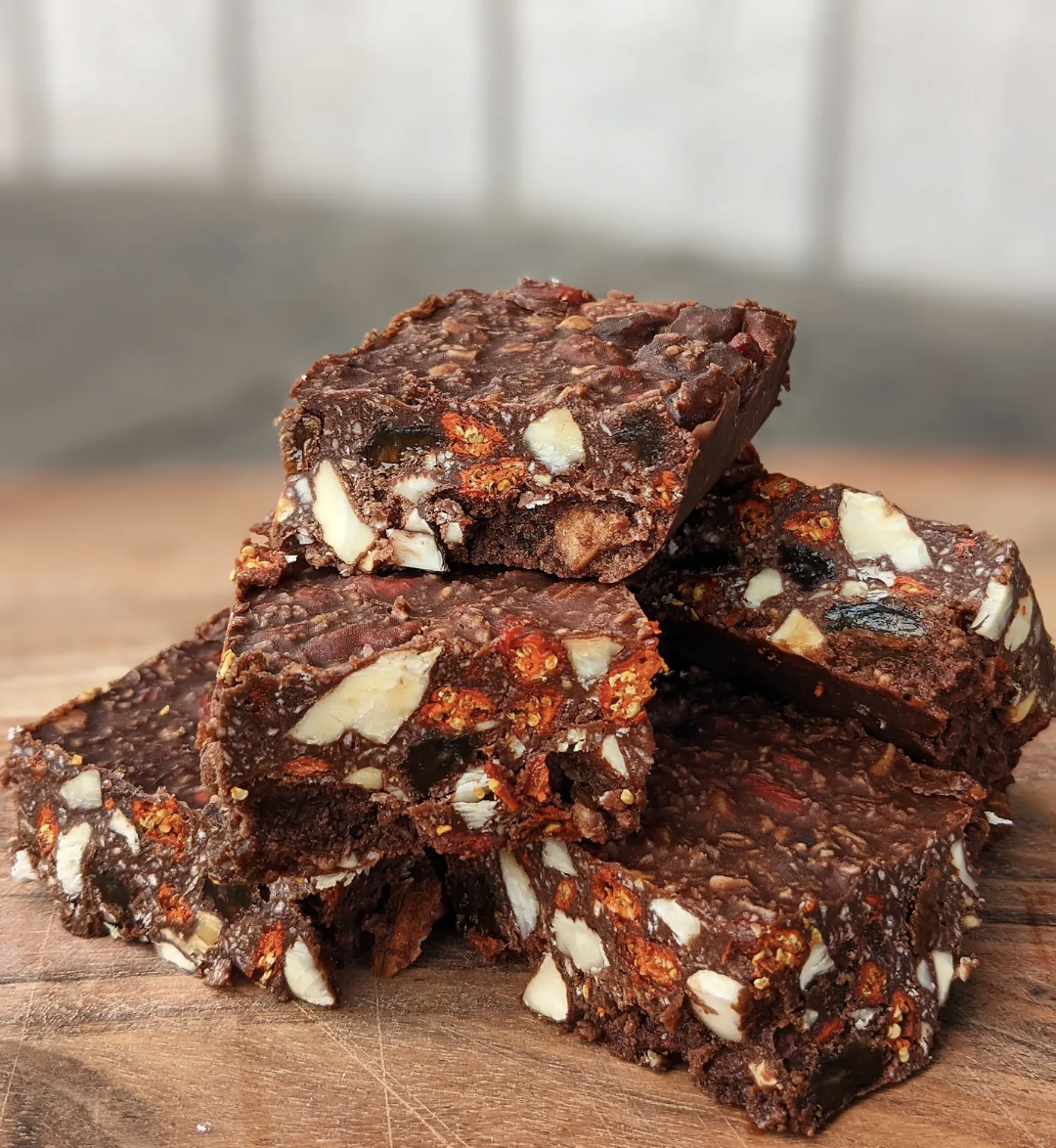 Our nutrient-packed Christmas Rocky Road is made with delightful ingredients like goji berries, sultanas, almonds, and nut butter.