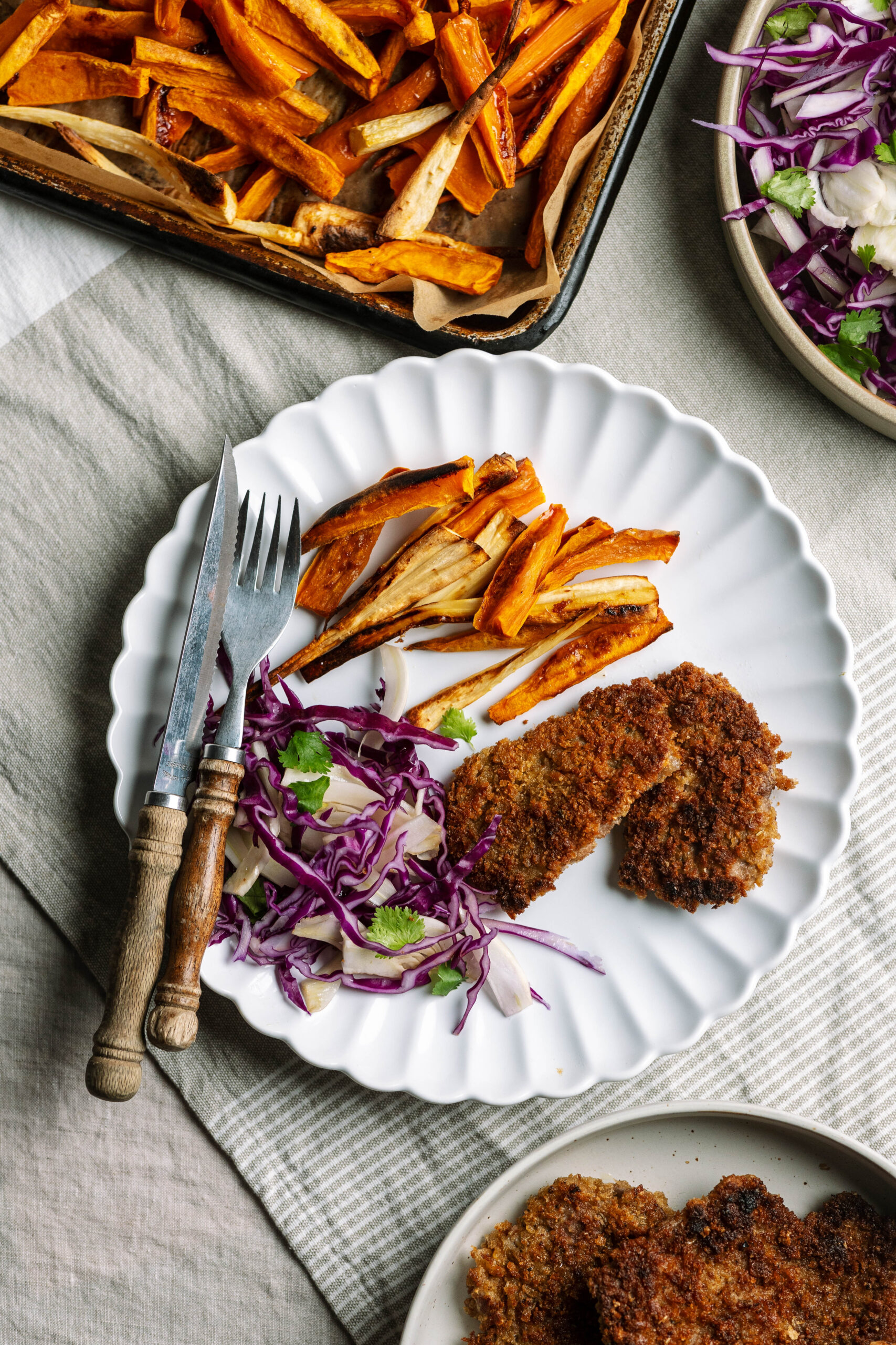 Herb Crusted Beef Schnitzel with Veg Chips and Slaw