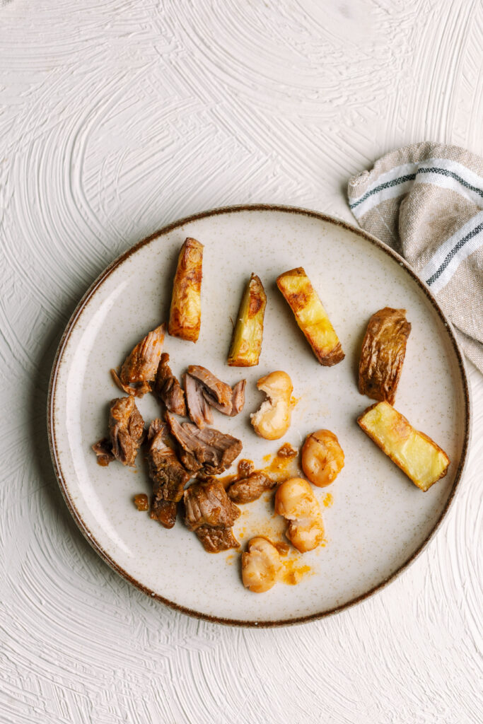 - For spoon-feeding: Mash or blend the pork, beans and veggies with a little broth until smooth or soft and lumpy.