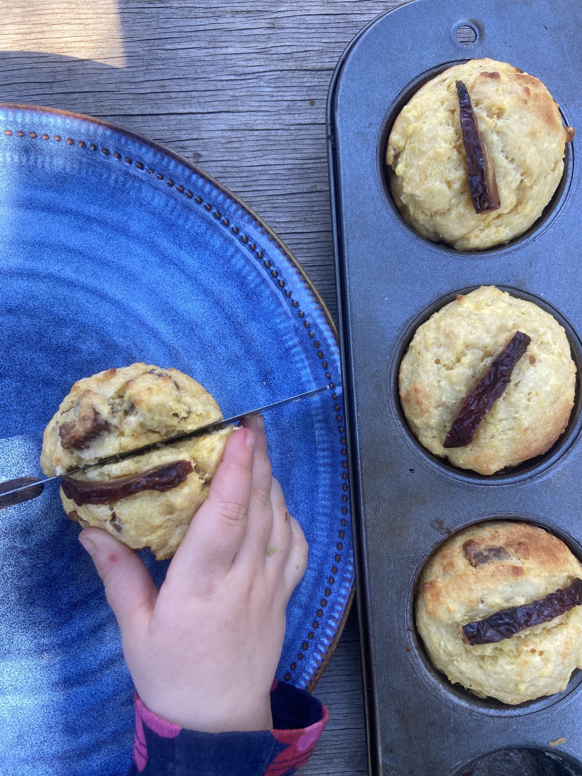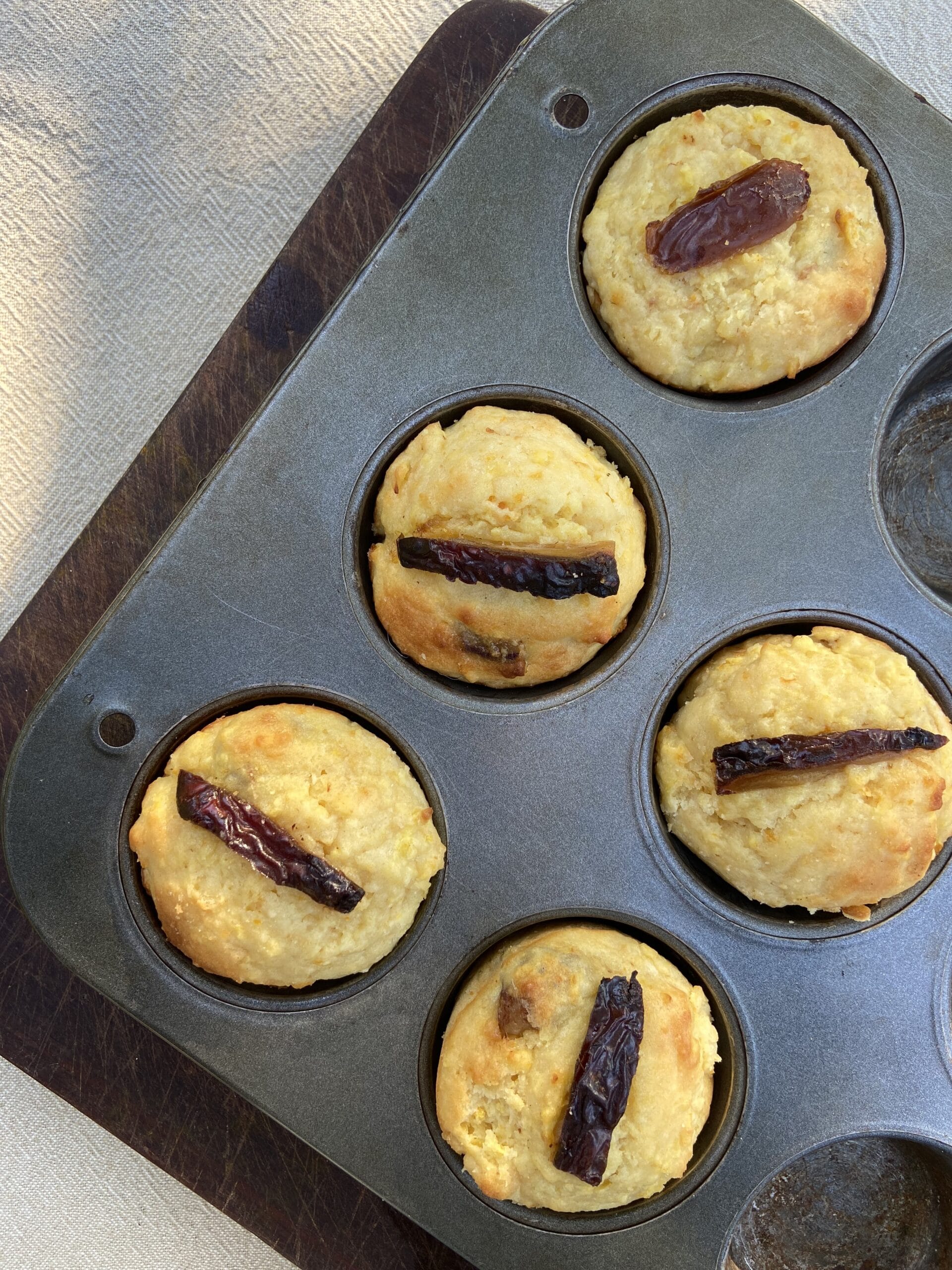 Divide evenly into a greased 12 muffin tray, Garnish with the remaining date if you desire and bake for 15-20 minutes.