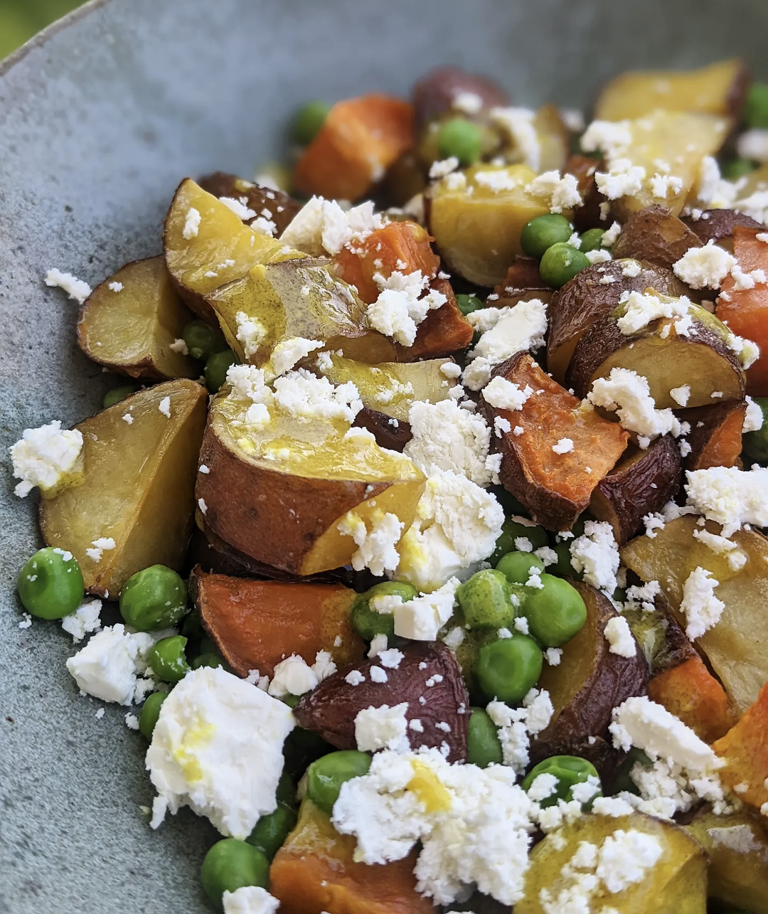 Add the roasted potatoes and sweet potatoes to a large bowl with the peas and crumbled feta