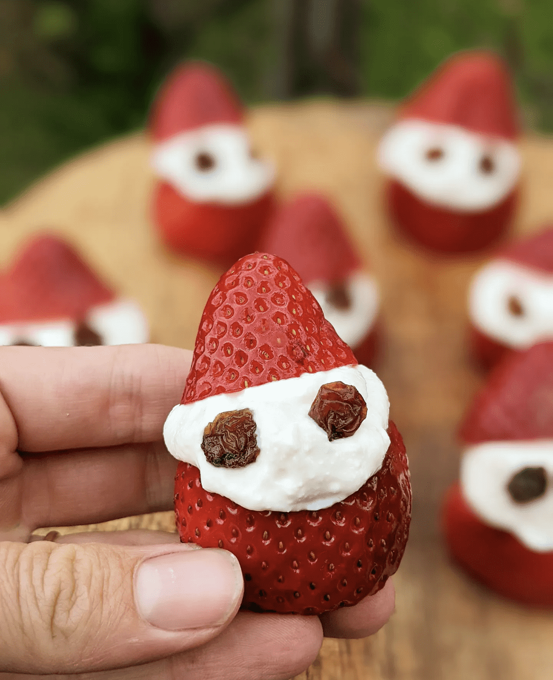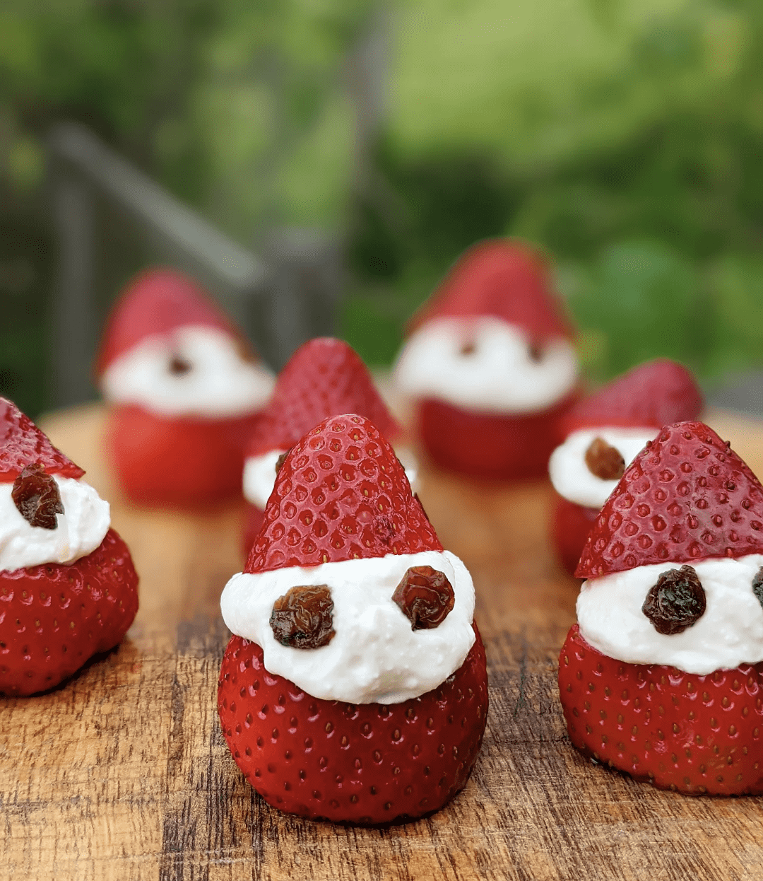 Place the tops of the strawberries onto the piped ricotta and add the Santa eyes using the sultanas