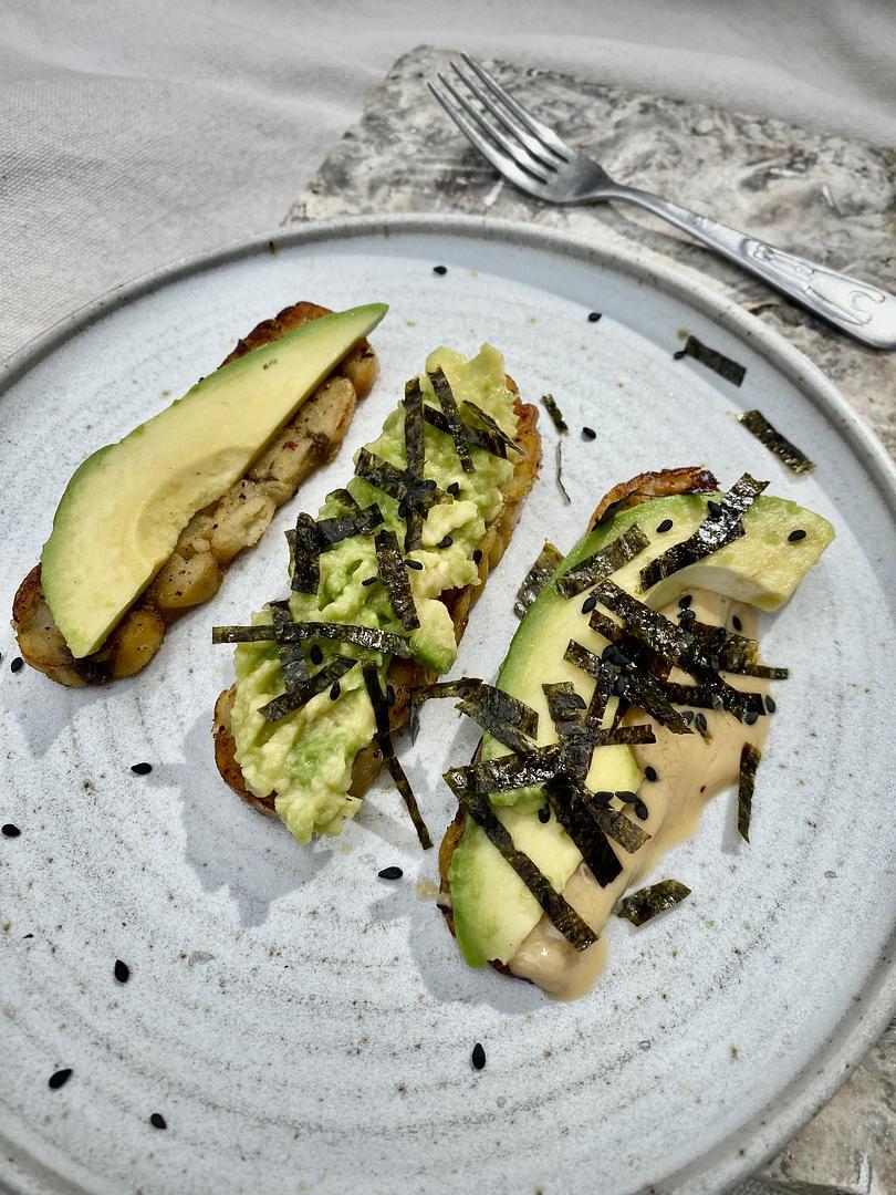 Add 100% peanut butter to top of tempeh strips, then pop some avocado on top before sprinkling with sesame seeds (these are extra tasty when toasted) and snipped nori strips.
