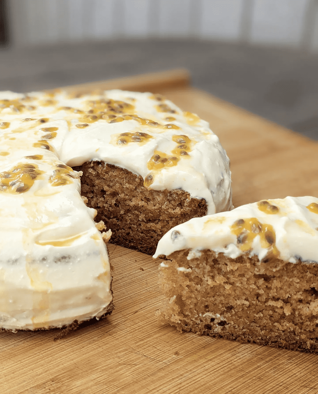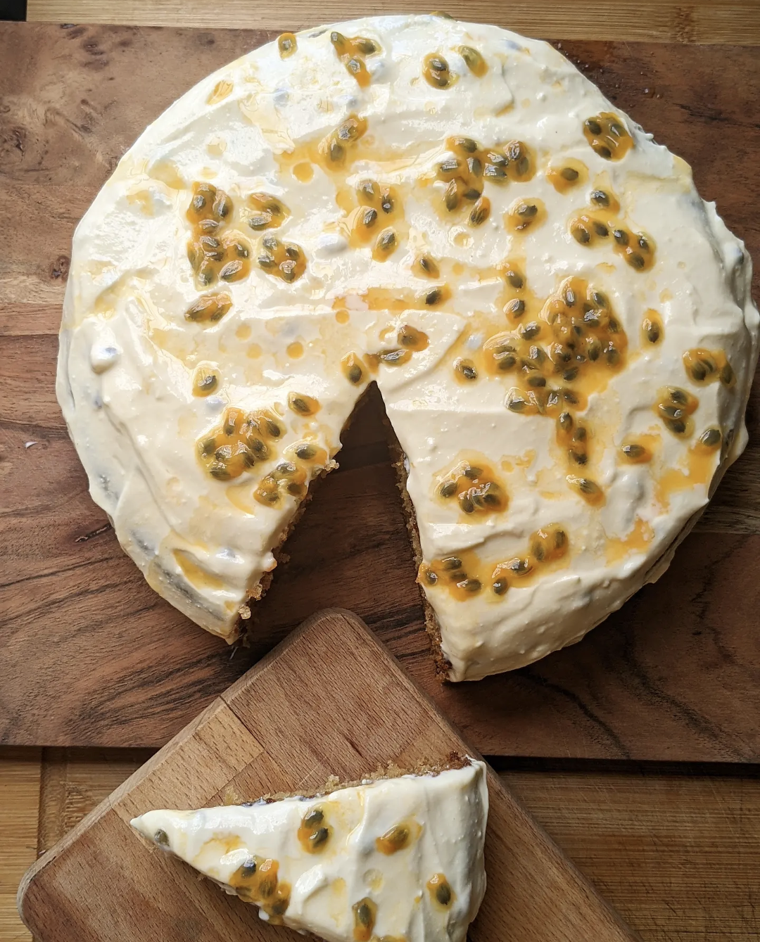 Vanilla lemon sponge cake with cream cheese passionfruit frosting