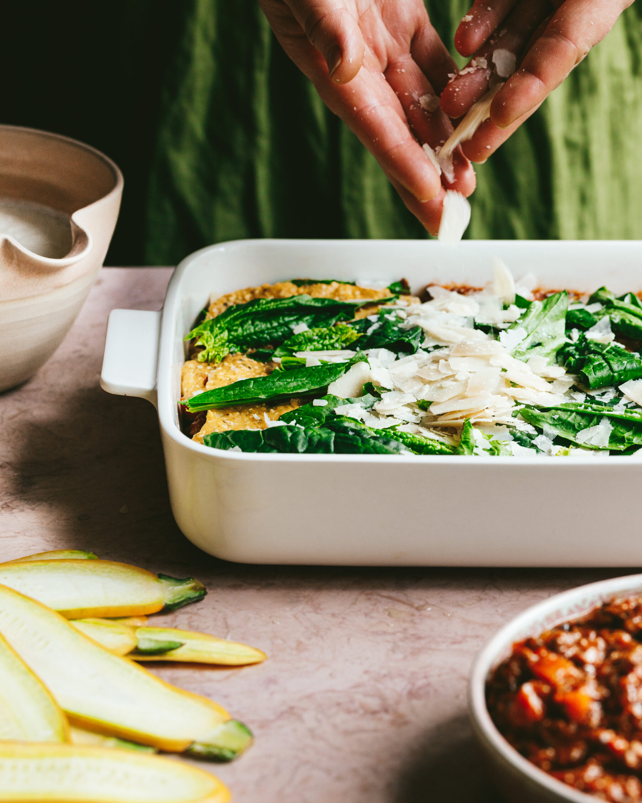 In a large baking dish (about 30cm x 15-20cm) place a third of your mince mixture, top with lasagne sheets, then top with 1/3 of pumpkin sauce and a layer of peeled zucchini, then 1/3 of the baby spinach, and 1/3 parmesan cheese.