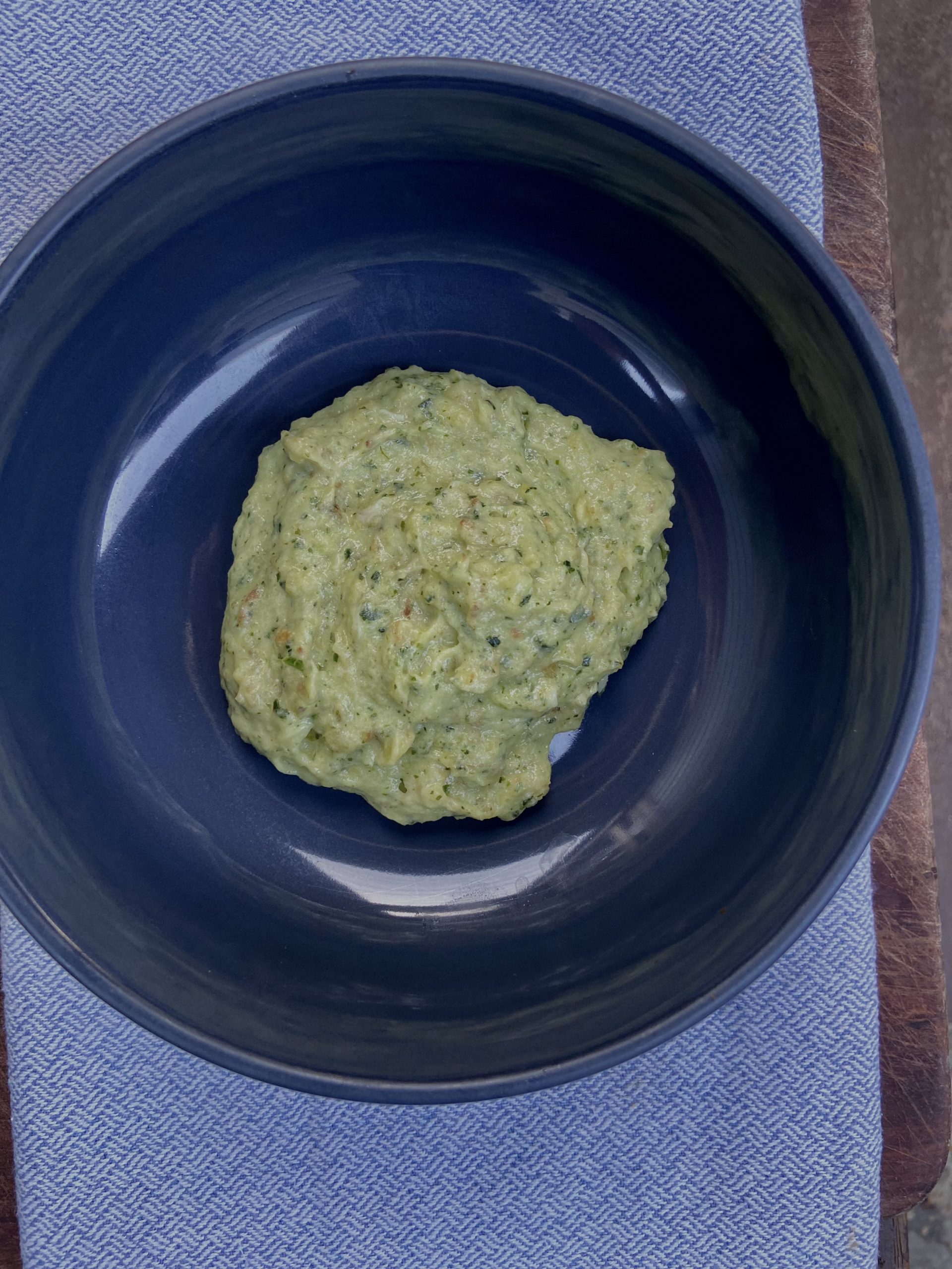 To serve as a puree, combine a small piece of fish, a tablespoon of green sauce, one or two wedges of potato and a wedge of avocado.