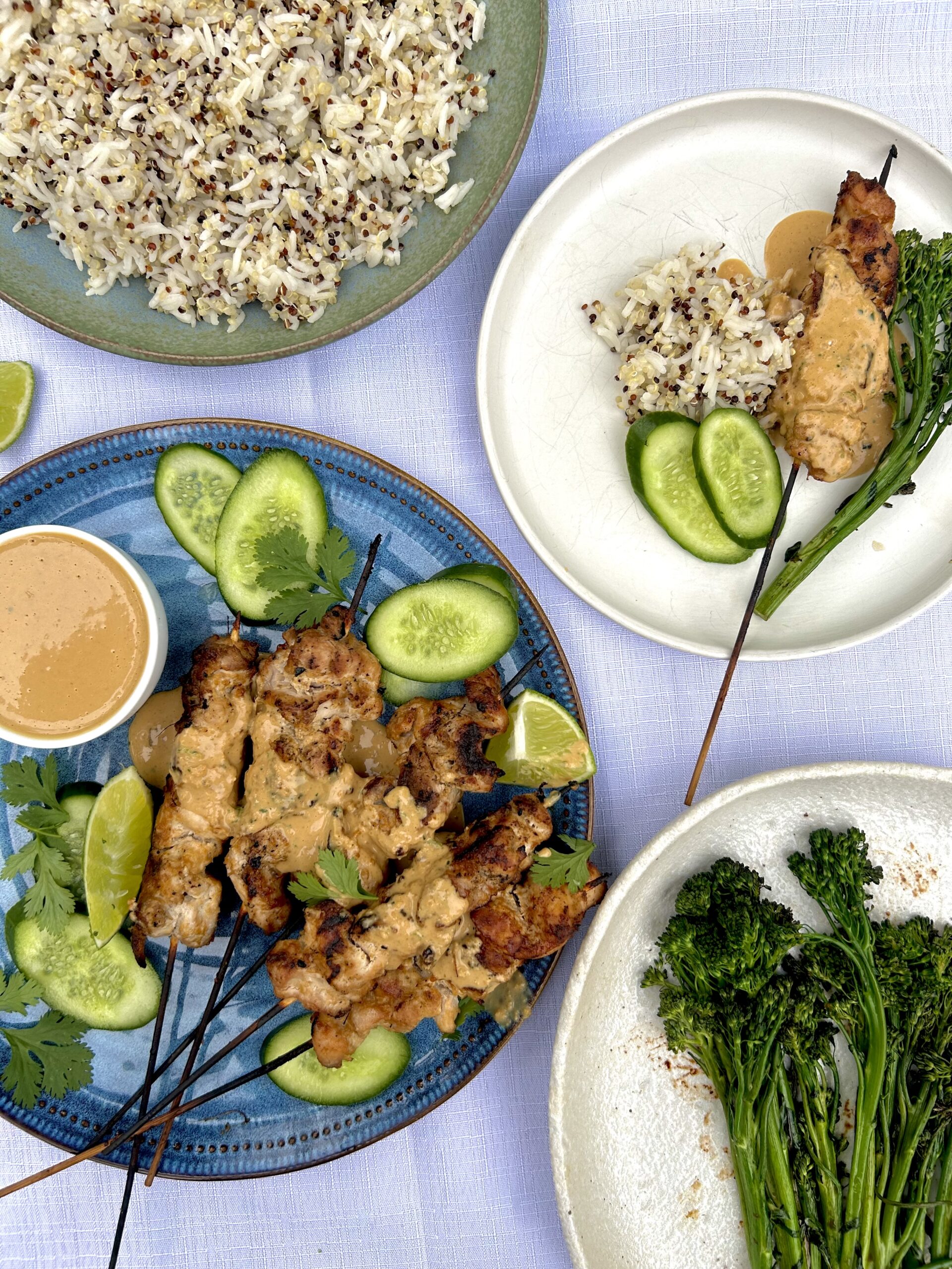 BLW – Serve a chicken skewer with rice and quinoa. Top with the satay sauce and a side of cucumber and broccolini