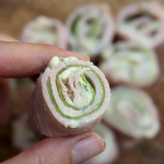 Roll up the ham from the smallest side first if you have uneven cut ham. Set aside on a plate and complete this process until you have used up all of the mixture