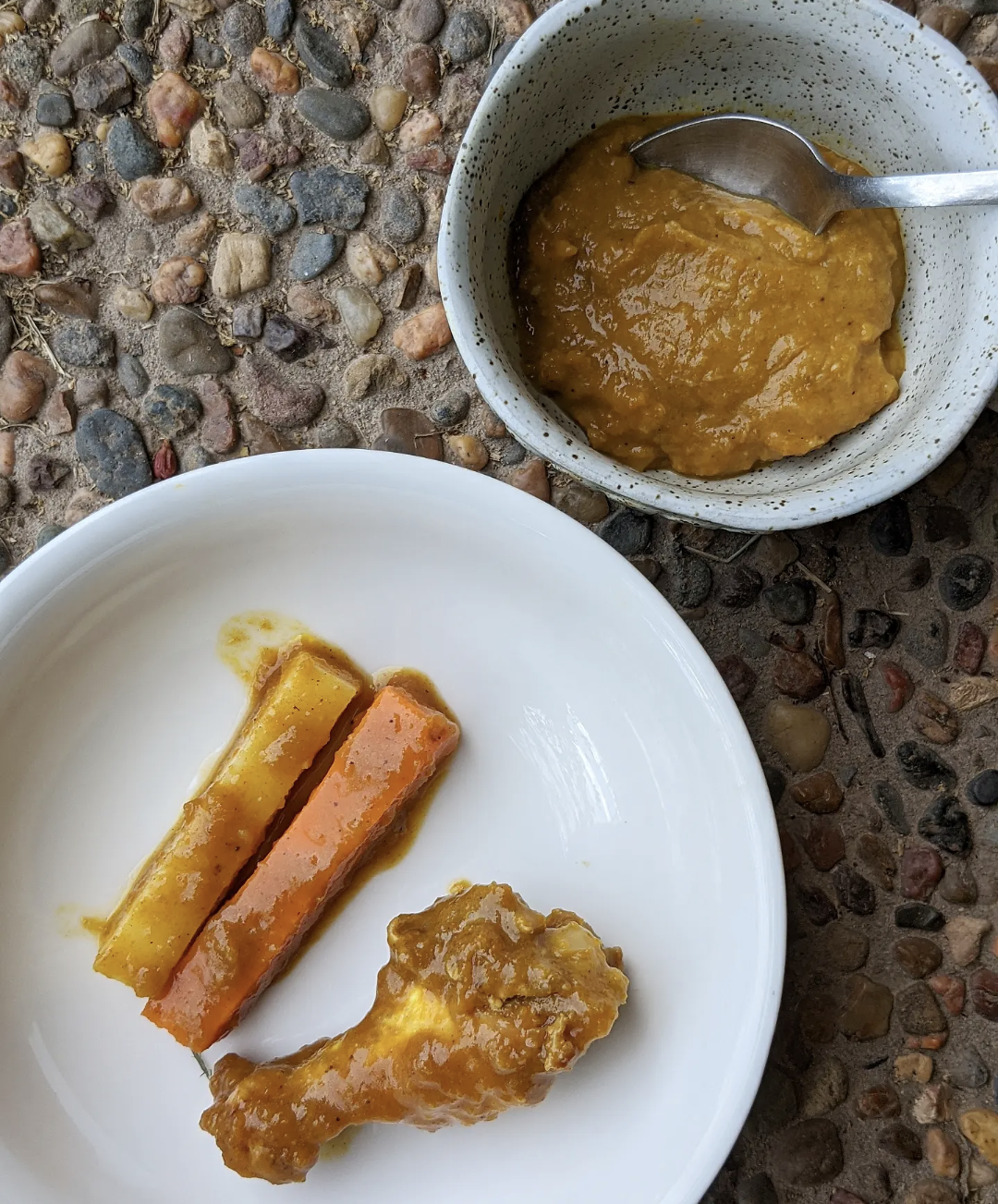 For BLW, slice the veggies into finger shapes and cook within the curry. Serve chicken strips or a chicken drumstick with the vegetables