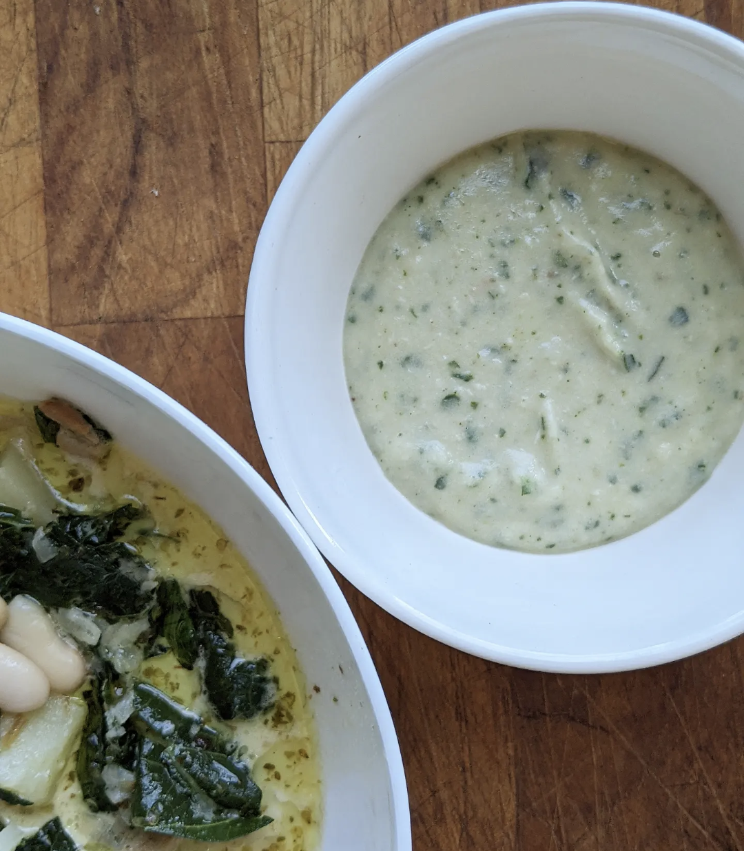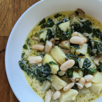 Allow the broth to simmer until the potatoes have almost just cooked, then add in the kale, grated parmesan cheese, cream and beans. Mix well