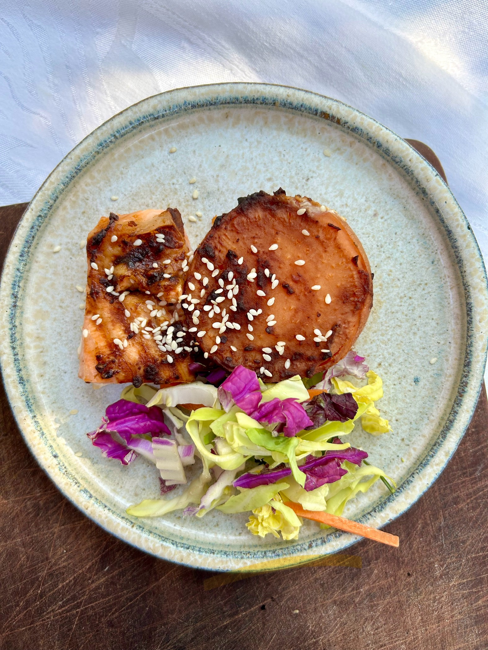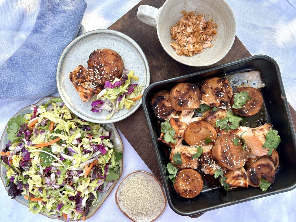 Miso baked trout and sweet potato with winter slaw