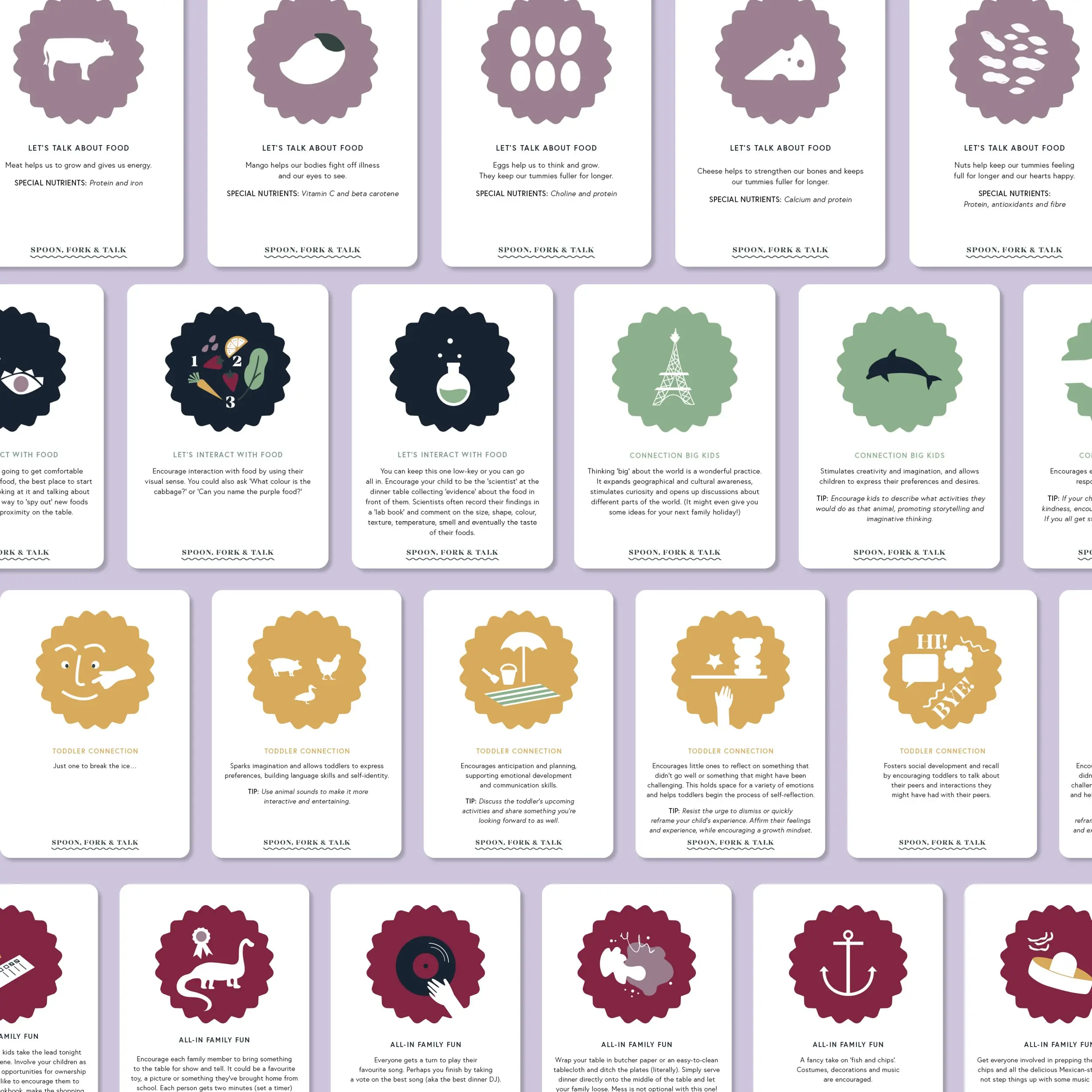 Spoon, fork and talk consists of 78 cards to play at mealtimes. The cards are focused on 5 main topics including connection, talking and interacting with food, and a whole lot of family fun. These cards are the perfect accompaniment to our book Toddler to Table and are guaranteed to leave the whole family feeling more connected.