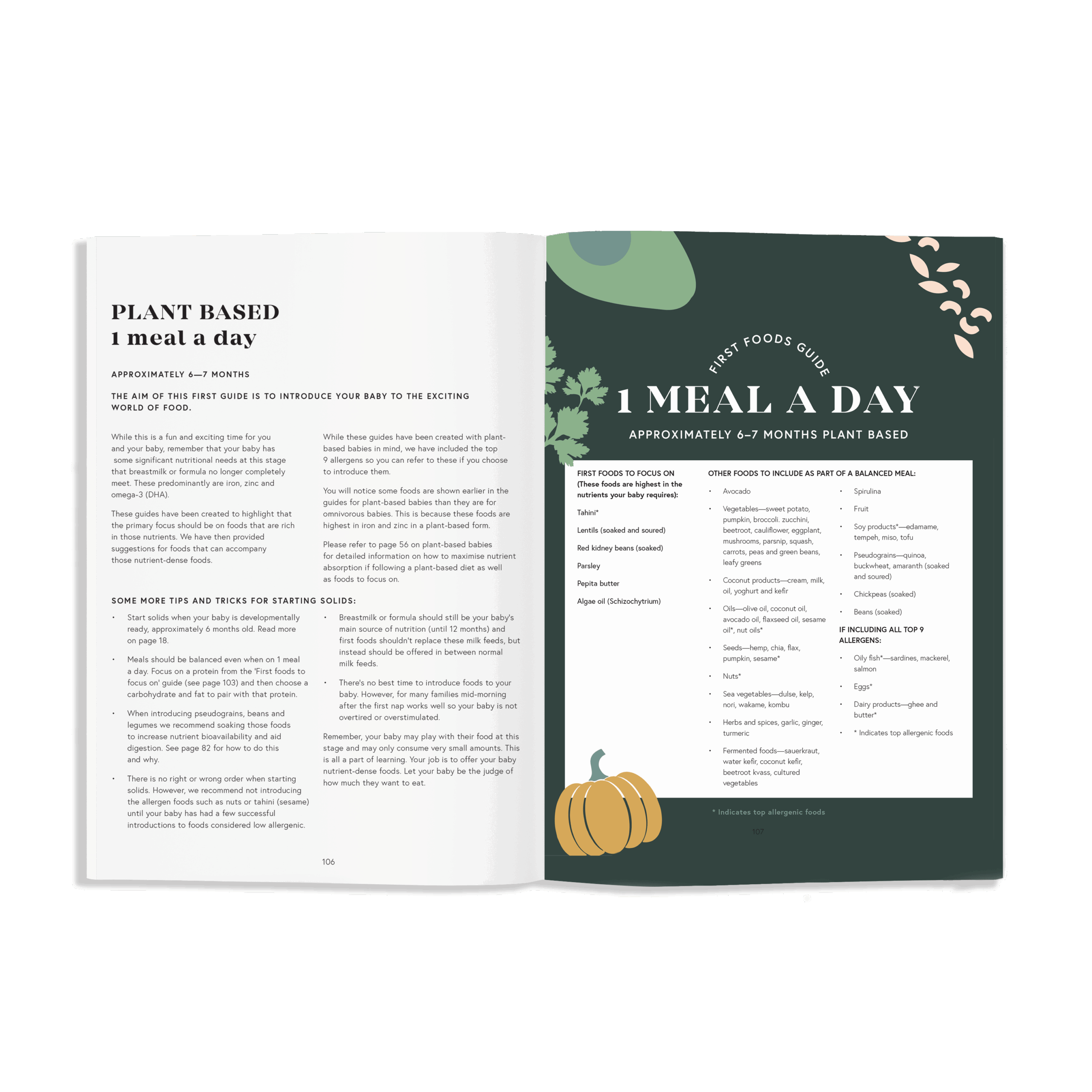 - First food guides for every age and stage and when to introduce each food group (omnivore and plant based options)