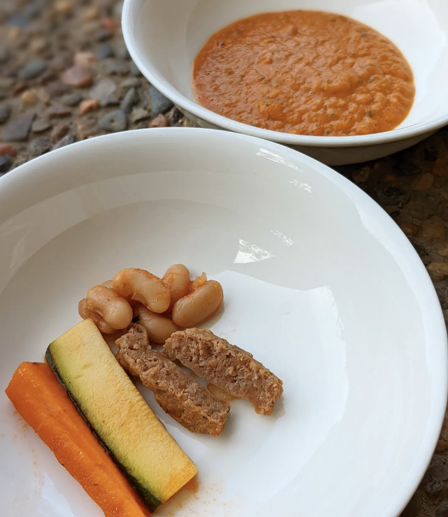For BLW, you can slice a couple of pieces of the carrot and zucchini into finger sized pieces to add to the soup when cooking. Slice the sausage into suitable BLW shapes to cook also. Serve with the beans, mashed between your fingers.