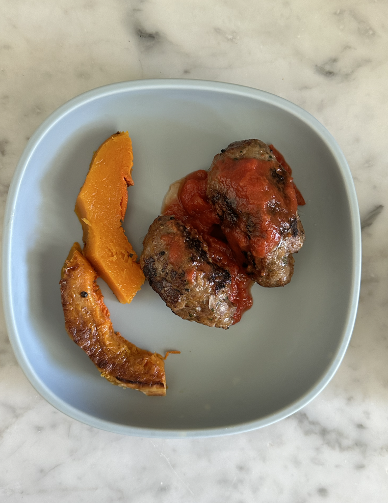For BLW under 9ish months of age (before pincer grasp has developed) you can shape the meatballs into ‘log’ shape so it’s easier for your baby to pick up and manoeuvre. You can serve it with some of the sauce, and whilst the meatballs are cooking you can pop a whole potato or small sweet potato, or some pumpkin slices in the oven to roast, which you can serve alongside.