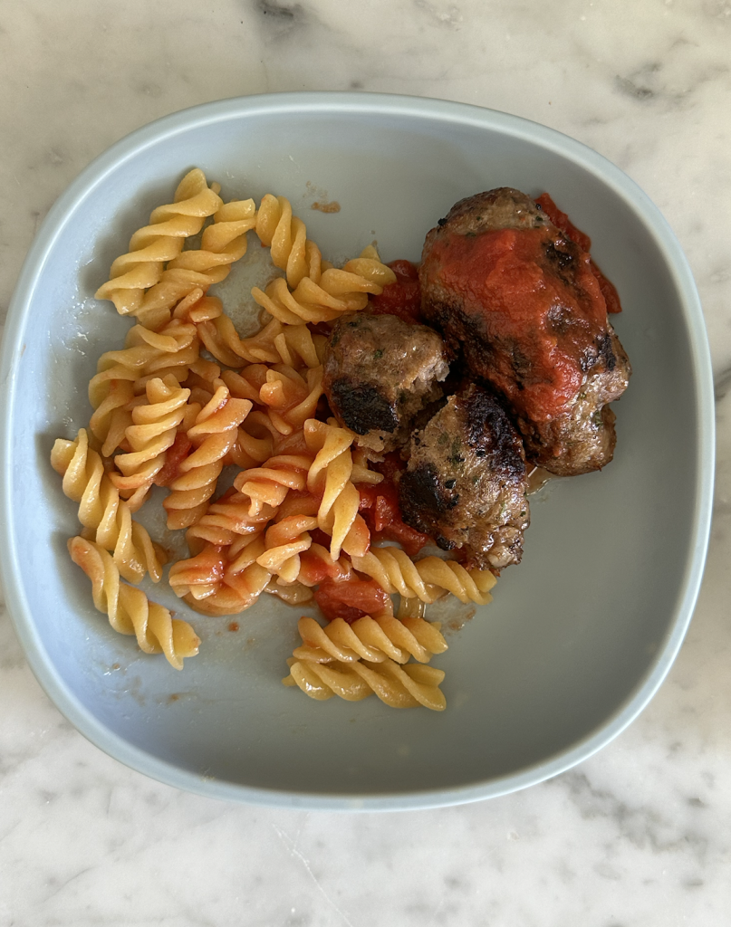 For BLW over 9ish months, you can offer the meatballs in log shape or chopped into bite sized pieces and serve with pasta (we chose red lentil pulse pasta for extra iron and protein).