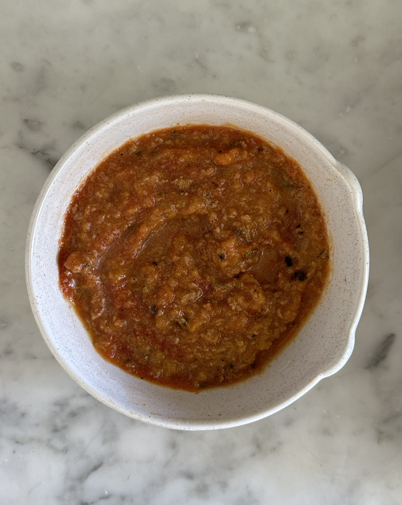 To make the Simple Sauce: place the casserole pot or frying pan back over the cooktop and reduce to a low heat and add the olive oil or ghee. Add the garlic and oregano, stirring frequently until golden and fragrant. Add the tomatoes and Bone Broth or water. Increase heat to medium-high heat and bring to the boil. Reduce heat to low and gently simmer for 45 minutes, but if you’re in a rush, it can be ready in 10 minutes!